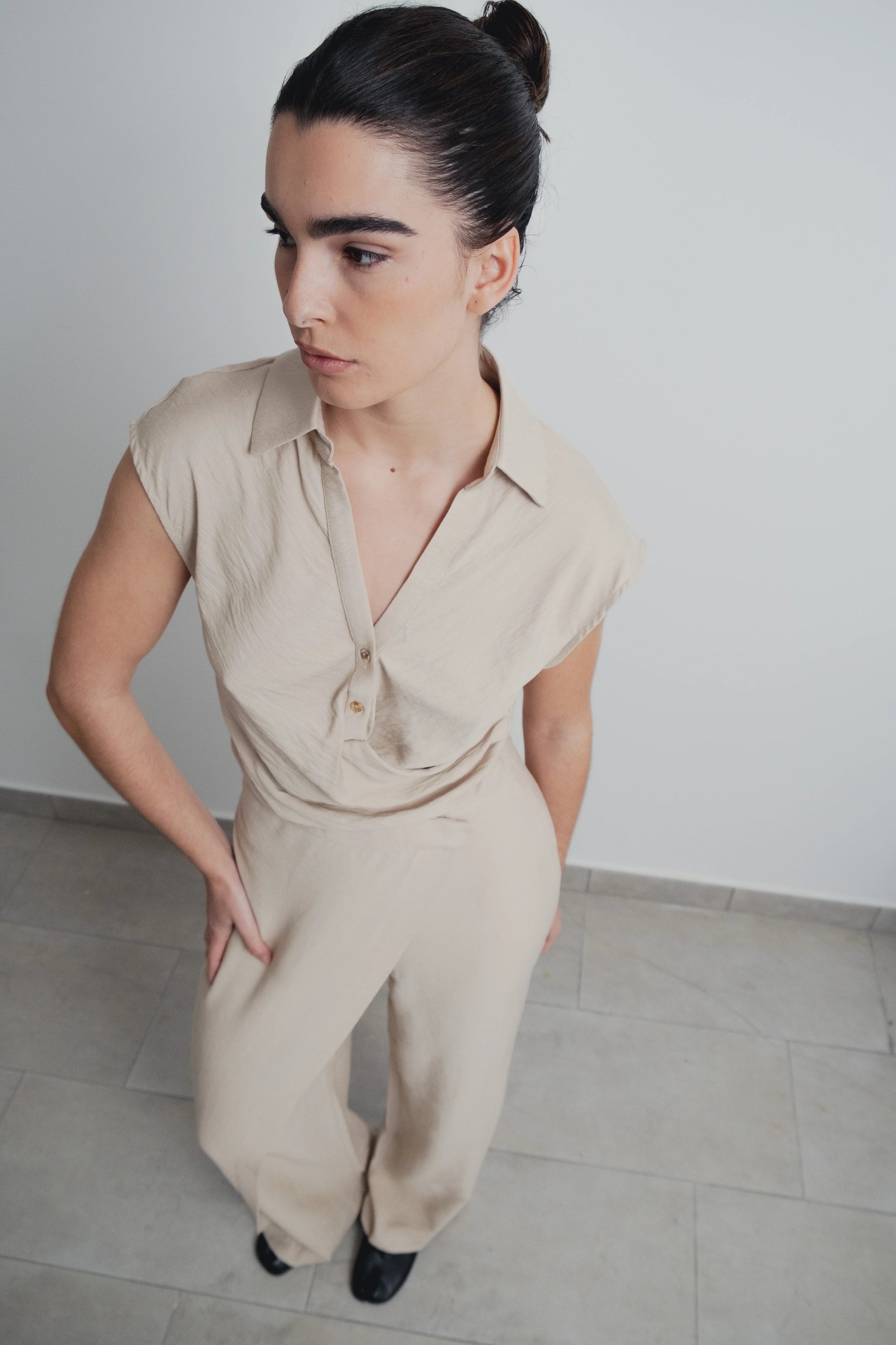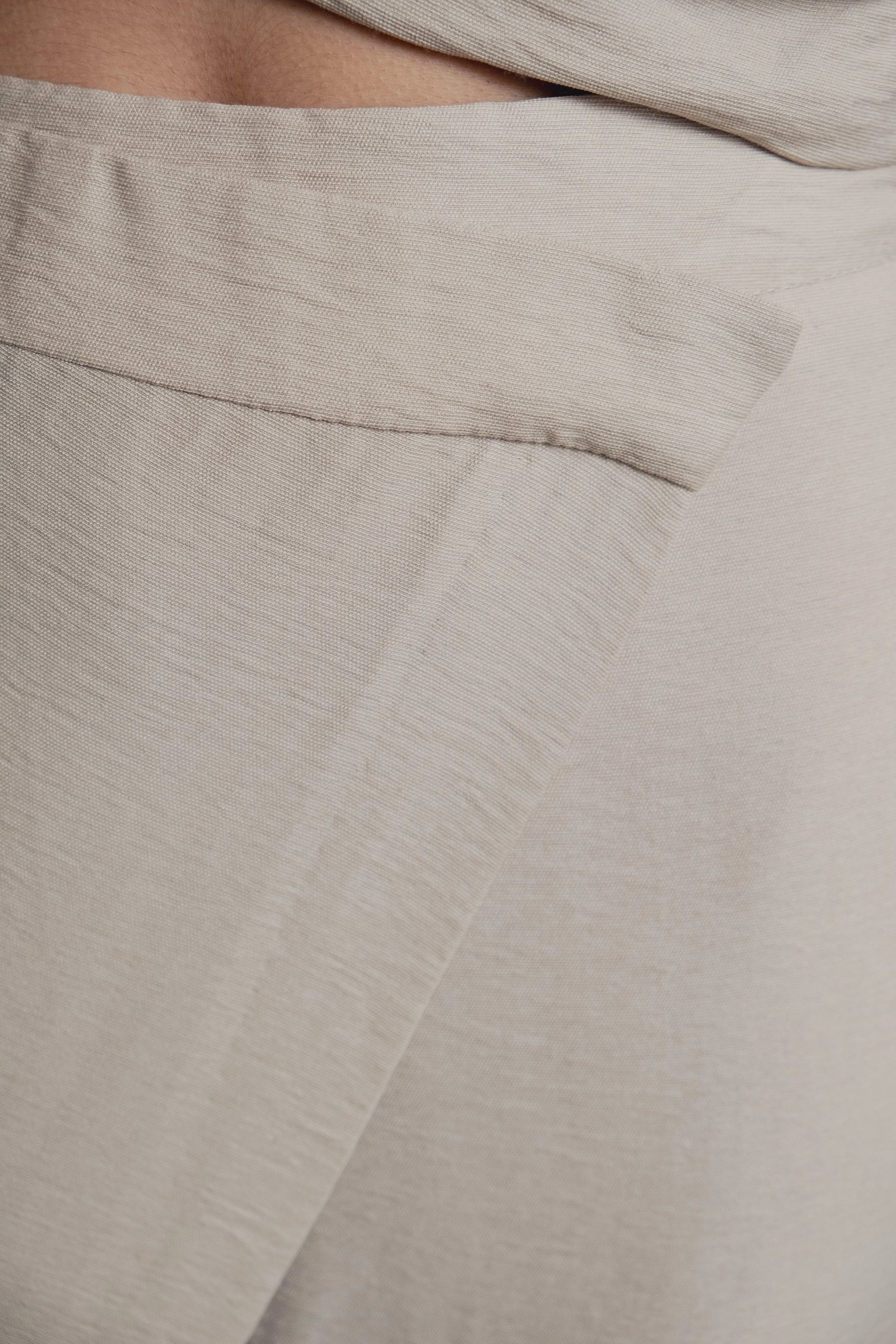 Calça tipo pareô de cintura média com falso bolso de vivo na parte de trás, fechamento lateral com zíper oculto na costura — sofisticada e confortável, perfeita para composições elegantes.