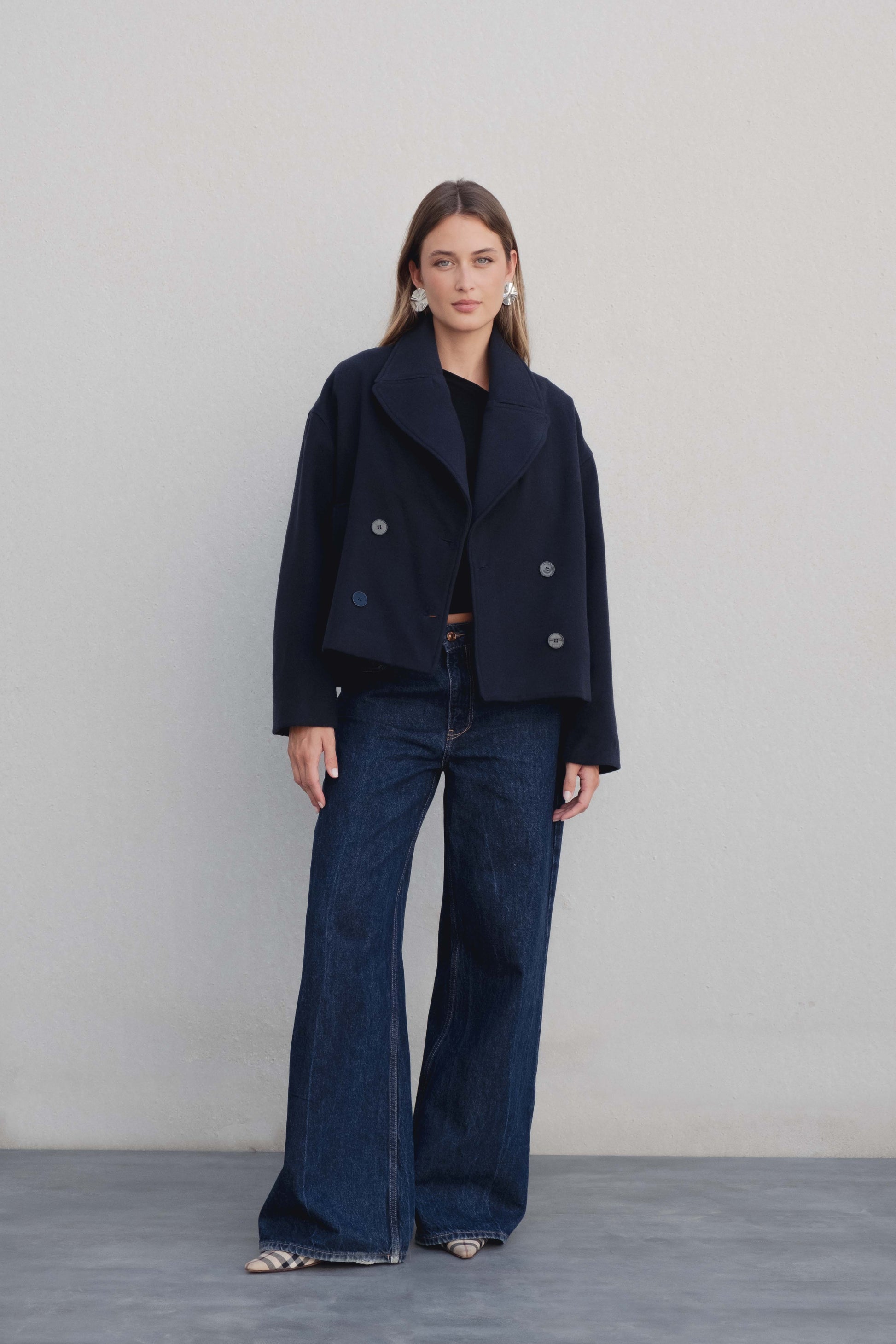 Casaco curto com gola de lapela e mangas longas, bolsos com aba, forro interno e fechamento frontal cruzado com botões — sofisticado e versátil, perfeito para composições elegantes.